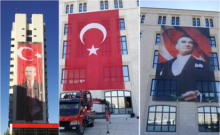 Firmamız, milli değerlerimizi en güçlü şekilde yansıtan büyük Atatürk posterleri ve Türk bayrakları üretiminde yüksek kalite standartlarını benimsemektedir. Bu ürünler, yalnızca bir görsel değil; aynı zamanda milletimizin bağımsızlığını, birlik ve beraberliğini simgeleyen kutsal sembollerdir. Türk Bayrağı Türk bayrağı, kırmızı zemin üzerinde beyaz ay ve yıldızdan oluşur. • Kırmızı renk, bağımsızlık uğruna verilen mücadelenin ve şehitlerimizin kanını temsil eder. • Ay ve yıldız, Türk milletinin tarih boyunca taşıdığı değerleri, özgürlüğü ve geleceğe olan inancını simgeler. Bayrağın renk tonları ve ölçüleri, resmi standartlara uygun şekilde üretilmekte; kumaş kalitesi ve baskı teknikleri sayesinde uzun süre canlılığını korumaktadır. Atatürk Posterleri Mustafa Kemal Atatürk’ün posterleri, özellikle milli bayramlarda, resmi törenlerde ve özel günlerde binalara, kurumlara ve meydanlara asılmaktadır. • Posterler, yüksek çözünürlüklü baskı teknikleriyle hazırlanır. • Dayanıklı kumaş ve vinil malzemeler kullanılarak iç ve dış mekan koşullarına uygun hale getirilir. • Farklı ölçülerde üretim yapılabilir; büyük binalar için dev boyutlarda, iç mekanlar için daha kompakt tasarımlar tercih edilebilir. Mekanizma ve Montaj • Bayrak ve posterler, sağlam metal mekanizmalarla desteklenir. • Direkler ve asma aparatları, rüzgar ve dış etkenlere karşı dayanıklı olacak şekilde tasarlanır. • Kolay montaj imkanı sunan sistemler sayesinde binalara, kurumlara ve açık alanlara güvenle asılabilir. Kullanım Alanları • Resmi kurumlar ve belediyeler • Okullar, üniversiteler ve eğitim kurumları • Dernekler, vakıflar ve özel kuruluşlar • Milli bayramlar, anma günleri ve özel etkinlikler